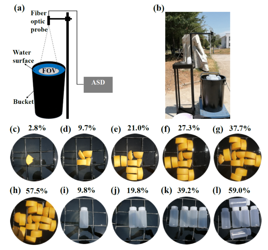 王胜强教授团队以近海常见的漂浮塑料垃圾(PVC浮标和PP塑料瓶)为研究对象,综合开展了室外控制测量试验(图4),以及理论模拟试验,深入分析了漂浮塑料垃圾的光谱特征,研究了漂浮塑料垃圾覆盖度对水体-垃圾反射混合光谱信号的影响机制。研究结果显示:漂浮塑料垃圾的反射率光谱值明显高于背景水体,尤其在近红外(Near Infrared,NIR)和短波红外(Shortwave Infrared,SWIR)波段;混合光谱分析表明,水体-垃圾混合反射率光谱值随塑料漂浮垃圾覆盖度增加呈线性增加;在SWIR波段,PVC浮标和PP塑料瓶具有相似的吸收谷特征,且吸收谷深度随覆盖度增加而加深。基于此,构建了塑料漂浮垃圾覆盖度定量反演的光谱指数(Floating Plastic Index,FPI),建立了漂浮塑料垃圾覆盖度定量反演模型,本研究成果为海洋漂浮垃圾遥感监测奠定了重要的光学理论基础。