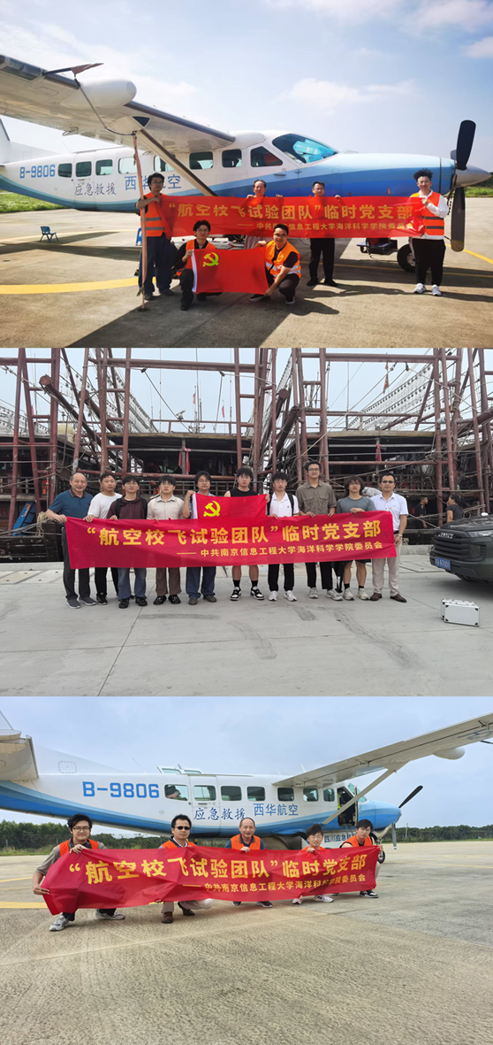 在双波束斜视SAR机载校飞试验现场,党旗始终在一线高高飘扬。为凝聚合力、强化保障,试验期间南京信息工程大学联合参与单位成立临时党支部,设立船载试验党小组和飞行试验党小组。将党建与重大科技攻关任务深度融合,为试验成功提供了坚强的组织保障。试验过程中,全体党员冲锋在前,以实际行动践行使命担当。在航空观测阶段,党员骨干带头攻坚,在空间局促、设备沉重的条件下,高效完成仪器挂载与校飞任务;在船载观测任务中,党员同志长时间坚守海上平台,无畏恶劣海况,保障了流场与风场数据精准可靠。在试验一线攻坚克难的同时,后方党员团队同样高效运转。他们肩负起统筹协调与运行保障的重任,一方面周密调研试验区域环境,评估测试条件;另一方面实时监控数据回传,确保信息流转顺畅,为前方决策提供了及时、可靠的技术支持。全体党员以“我是党员我先上”的担当,在设备安装、飞行观测、数据校验各环节发挥先锋模范作用。